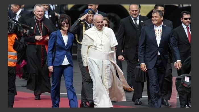 El papa inició este domingo su gira latinoamericana al arribar a Quito. El presidente Rafael Correa encabezó la bienvenida. Este lunes, el sumo pontífice viajará al suroeste del país.